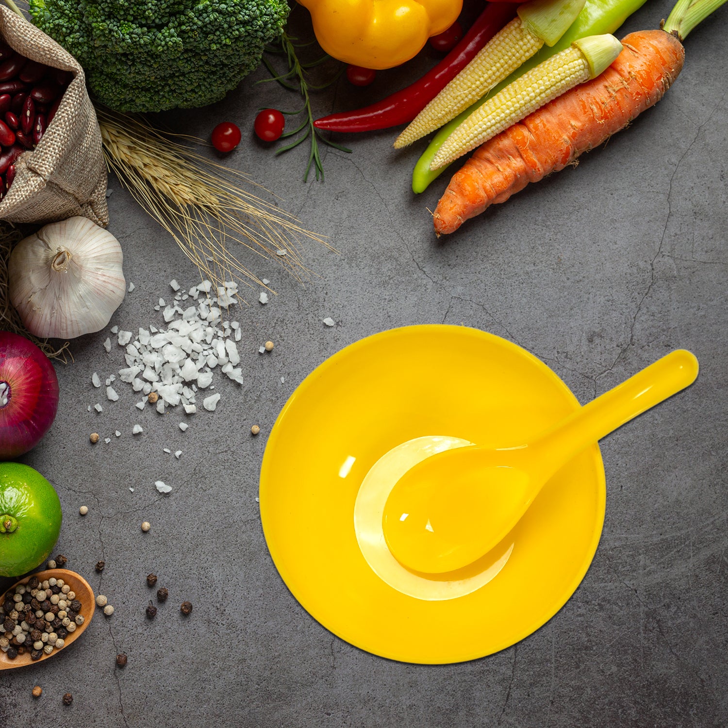 - SET CONTENTS: Complete dining set includes 6 bright yellow soup bowls and 6 matching spoons, perfect for family meals and gatherings